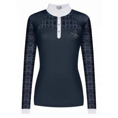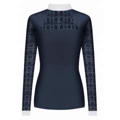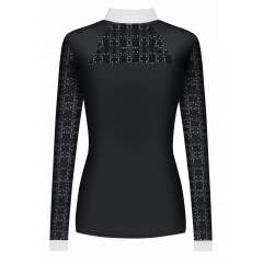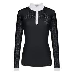 Eleganttinen pitkähihainen kisapaita naisellisella leikkauksella. Valmistettu joustavasta ja hengittävästä kierrätyskankaasta, jossa on UV-suoja kesää varten. Parannettu ilmankierto joustavien pitsiosien ansiosta edessä, takana sekä hihoissa. Kiinnitys edestä kolmella koristenapilla. Koristeltu brodeeratulla kirstalleilla varustetulla FairPlay-logolla.