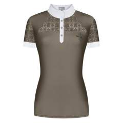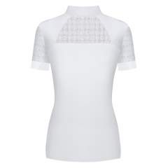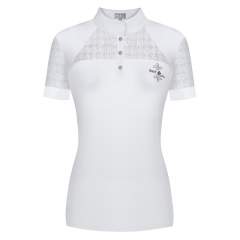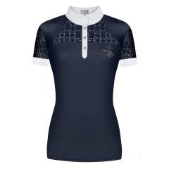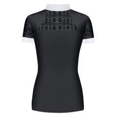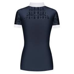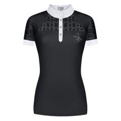 Eleganttinen pitkähihainen kisapaita naisellisella leikkauksella. Valmistettu joustavasta ja hengittävästä kierrätyskankaasta, jossa on UV-suoja kesää varten. Parannettu ilmankierto joustavien pitsiosien ansiosta edessä, takana sekä hihoissa. Kiinnitys edestä kolmella koristenapilla. Koristeltu brodeeratulla kirstalleilla varustetulla FairPlay-logolla.