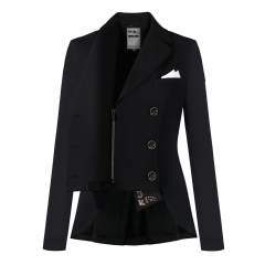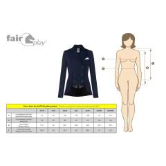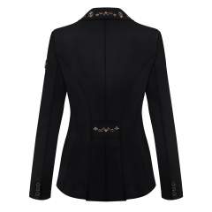 Tyylikäs lyhyt kisafrakke, joka korostaa naisellista siluettia. Nappien takana piilovetoketju, jonka ansiosta takki istuu mukavasti päällä. Valmistettu erittäin hengittävästä ja joustavasta COMFINAT-tech kankaasta. Takissa on koristeellinen ruusukulta-kirjonta edessä, kauluksessa ja selässä. Koristeelliset ruusukulta viimeistellyt napit hihoissa sekä edessä. Mukana valkoinen satiininen kangas taskuun laitettavaksi. Kevyt verkkovuori lisää ilmankiertoa, joka on ihanteellinen kuumiin kisapäiviin kesäisin. Viimeistelty FairPlay logolla hihassa.