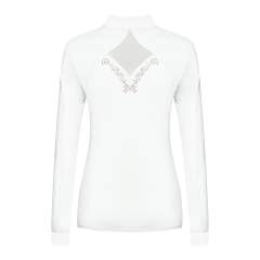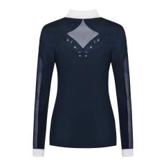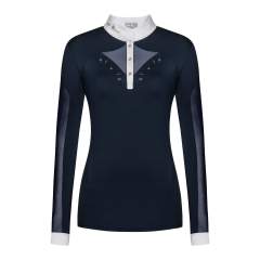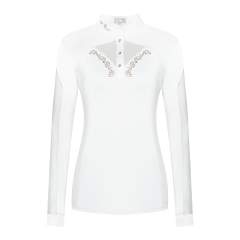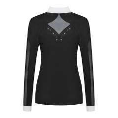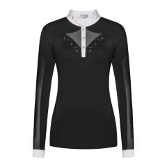 Tyylikäs ja naisellinen pitkähihainen kisapaita, joka on valmistettu joustavasta ja hengittävästä kankaasta, jossa on UV-suoja. Rinnassa ja selässä ilmankiertoa parantavat joustavat meshverkot, joidenka ympärillä on ruusukultaiset koristekivet juuri täydelliseen viimeistelyyn! Sopii täydellisesti kuumiin kisapäiviin.