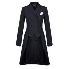 Valmistettu erittäin hengittävästä sekä joustavasta COMFINAT Tech-kankaasta. Tämä kangas auttaa takkia istumaan juuri oikein päälläsi. Kaulus, takaläpät sekä yläselässä on huomaamattomat, mutta elegantit koristekristallit. Takin läpät ovat tasaisesti punnitty ja vuorattu synteettisellä nahalla. Verkkovuori takissa parantaa ilmankiertoa ja on hyödyllinen kuumina kisapäivinä. Mukana taskuneliö ja kaksi vaihdettavaa läppää.