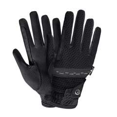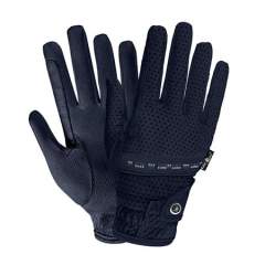 Tyylikäs ja kevyt ratsastuskäsine kesälle. Kämmen valmistettu ohuesta, luistamattomasta synteettisestä nahasta. Kevyt ja joustava verkkomateriaali kämmenen selkäpuolella. Värissä musta ja navy kosketusnäyttösormet. Koristeltu kimaltavilla koristekivillä. Kiinnitys ranteessa.