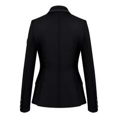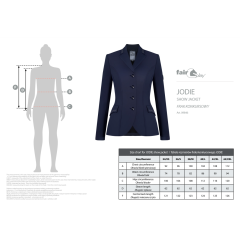 Urheilullinen ja tyylikäs Jodie kisatakki. Selässä tuuletusaukot paremman hengittävyyden vuoksi. Nappien takana pillovetoketju, joka parantaa istuvuutta. Valmistettu erittäin hengittävästä sekä joustavasta COMFINAT-tech kankaasta. Elegantti koristeellinen kirjonta hevosaiheisella kuviolla ja strassilla kauluksessa sekä etutaskuissa. Kaksi etutaskua piilotetuilla painonapeilla. Hengittävä verkkovuori ja viimeistelty Fair Play logolla hihassa.