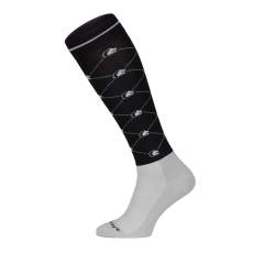 Uudistettu ja paranneltu Logo ratsastussukat, jotka on suunniteltu sopimaan saappaiden tai chapsien alle ilman ylimääräisiä painepisteitä. Hengittävä sukka, jossa on pehmustettu jalkaterä