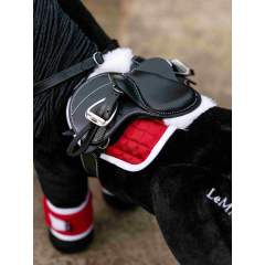 Juhlava leluponisetti, johon kuuluu korvahuppu, satulahuopa ja pintelit
