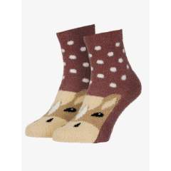 Superpehmeä pörröinen kangas tarjoaa lämpöä, kun taas poniteema, pilkkuprintti ja brodeerattu LeMieux brändäys viimeistelevät sukan ulkonäön.