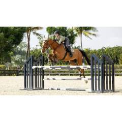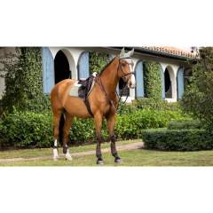Tunnettu LeMieuxin estehuopamalli, jossa on korkea säkäleikkaus, joustavat D-rengashihnat sekä satulavyölle oma hihna sekä hankausta ja kulumaa estävä nahkaosuus.